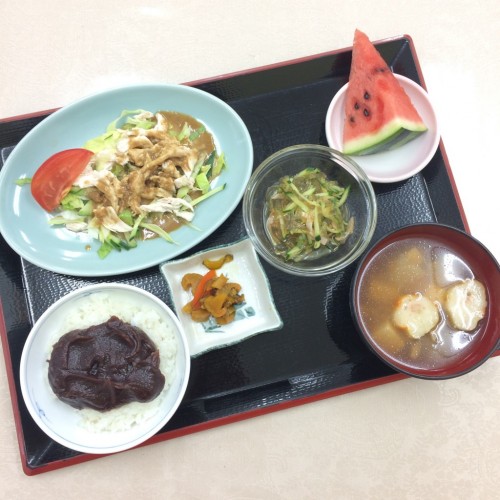 メニューは、ぼた餅、バンバンジー、ところてんサラダ、すまし汁、漬物、スイカです!