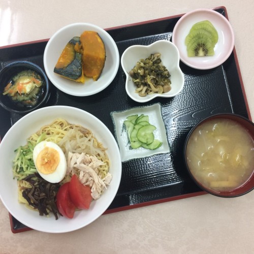 メニューは、冷やし中華、かぼちゃの煮物、高菜としめじの和え物、ゴーヤの和え物、味噌汁、漬物、キウイです!