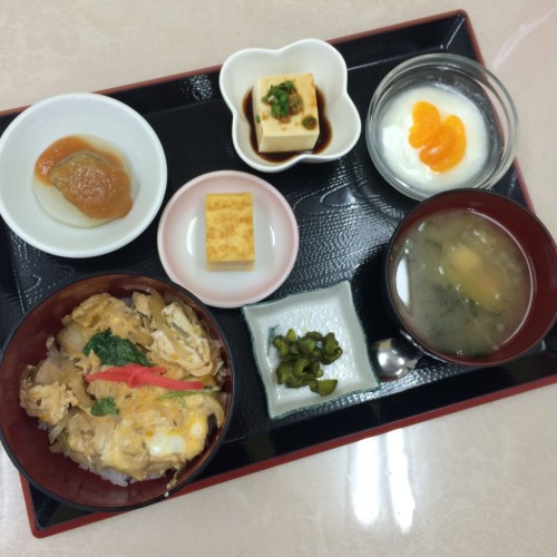 メニューは、親子丼、大根の味噌田楽、冷奴、玉子焼き、味噌汁、漬物、ヨーグルトです!