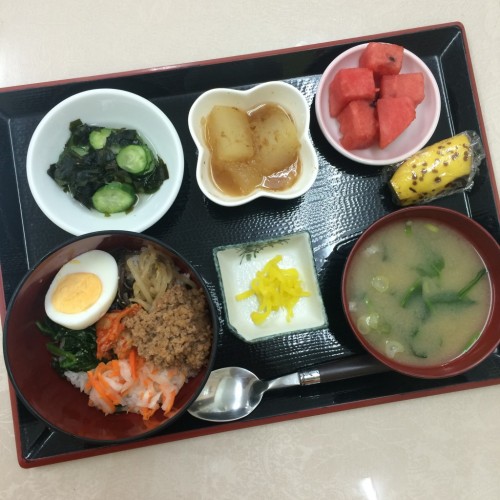 メニューは、ビビンバ丼、冬瓜の煮物、わかめときゅうりの酢の物、味噌汁、漬物、スイカ、バナナです!
