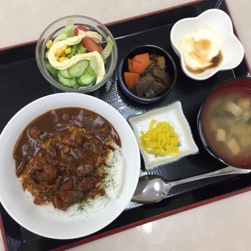 メニューは、ハヤシライス、刻み昆布の煮物、野菜サラダ、スープ、漬物、ヨーグルトです!