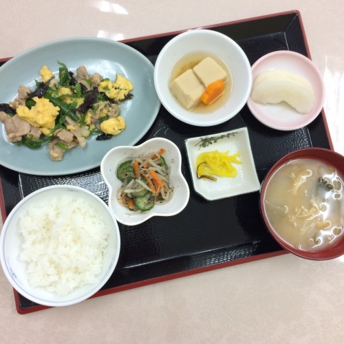 メニューは、豚肉ときくらげの玉子炒め、高野豆腐の煮物、もやしのごま酢和え、ごはん、味噌汁、漬物、梨です!