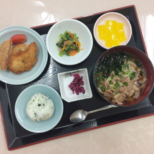 メニューは、肉うどん、ハムカツ、青菜の酢みそ和え、ミニおにぎり、漬物、オレンジゼリーです!