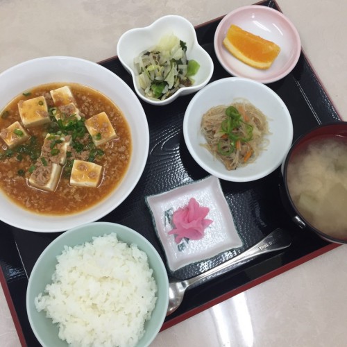 メニューは、麻婆豆腐、春雨の炒め物、もやしのナムル、ごはん、味噌汁、漬物、オレンジです!