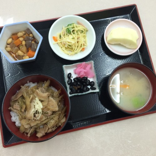 メニューは、豚丼、大豆の煮物、スパゲッティサラダ、味噌汁、漬物、黒豆、りんごです!