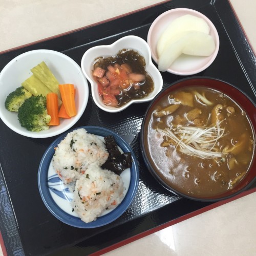 メニューは、カレーうどん、蒸し野菜、もずく酢、ミニおにぎり、漬物、梨です!