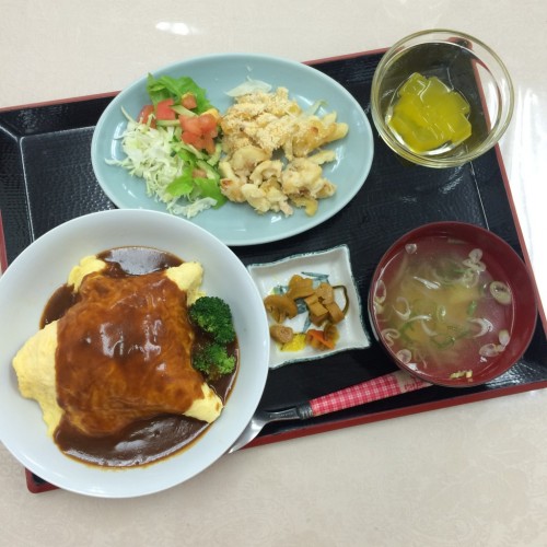 メニューは、オムライス、グラタン、野菜サラダ、スープ、漬物、フルーツゼリーです!