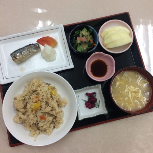 メニューは、栗の炊き込みご飯、焼き魚、青菜の酢みそ和え、味噌汁、漬物、りんごです!