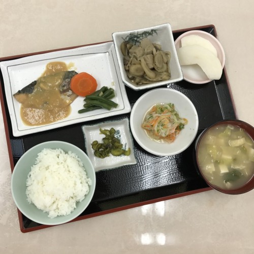 メニューは、さばのみそ煮、ごぼうの煮物、大根なます、ごはん、味噌汁、漬物、梨です!