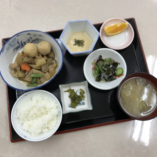 メニューは、筑前煮、とろろ、きゅうりとわかめの酢の物、ごはん、味噌汁、漬物、オレンジです!