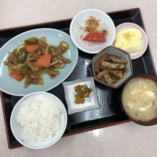 メニューは、酢豚、刻み昆布の煮物、トマトと玉ねぎの和風サラダ、ごはん、味噌汁、漬物、りんごです!