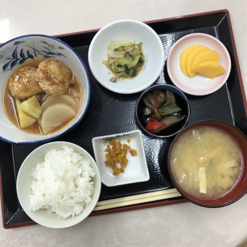 メニューは、豆腐つくねの煮物、なすの炒め物、青菜の酢みそ和え、ごはん、味噌汁、漬物、柿です!
