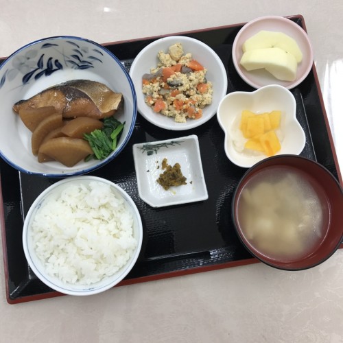 メニューは、ぶり大根、炒り豆腐、柿なます、ごはん、味噌汁、漬物、りんごです!