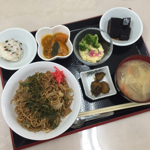 メニューは、焼きそば、かぼちゃの餡かけ煮、玉子サラダ、ミニおにぎり、味噌汁、漬物、コーヒーゼリーです!
