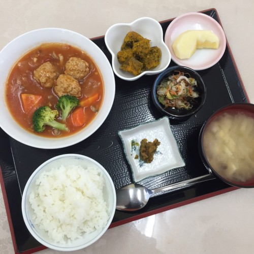 メニューは、肉団子のトマト煮、かぼちゃの胡麻和え、白菜の和え物、ごはん、味噌汁、漬物、りんごです!