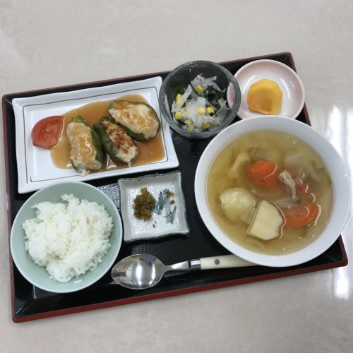 メニューは、ポトフ、ピーマンの肉詰め、わかめサラダ、ごはん、漬物、柿です!