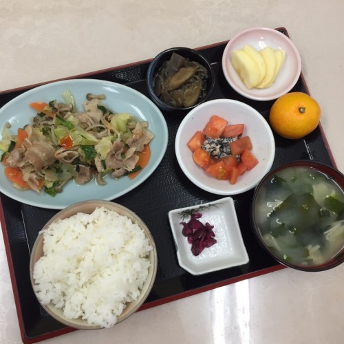 メニューは、肉野菜炒め、しらたきとごぼうのしぐれ煮、トマトサラダ、ごはん、味噌汁、漬物、りんご、みかんです!