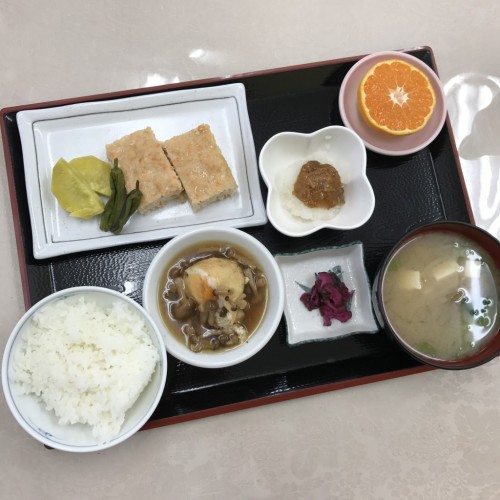 メニューは、松風焼、煮玉子と野菜の炊き合わせ、大根のなめたけ和え、ごはん、味噌汁、漬物、みかんです!
