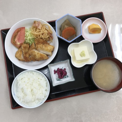 メニューは、チキンカツ、里芋の煮物、冷奴、ごはん、味噌汁、漬物、柿です!