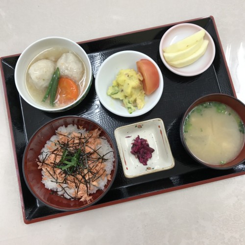 メニューは、鮭丼、炊き合わせ、さつま芋サラダ、味噌汁、漬物、りんごです!