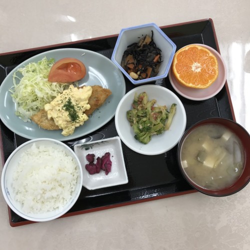 メニューは、白身魚のフライ、ひじきの煮物、ブロッコリーの和え物、ごはん、味噌汁、漬物、みかんです!