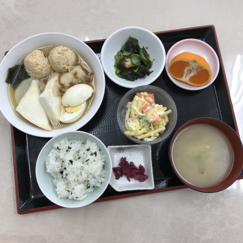 メニューは、おでん、マカロニサラダ、きゅうりとわかめの酢の物、わかめごはん、味噌汁、漬物、みかんです!