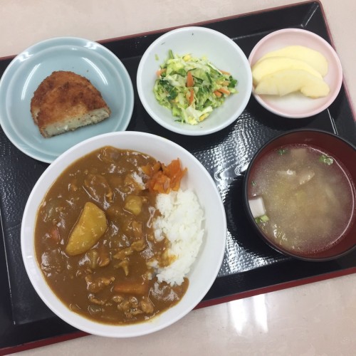 メニューは、カレーライス、コロッケ、コールスローサラダ、スープ、りんごです!
