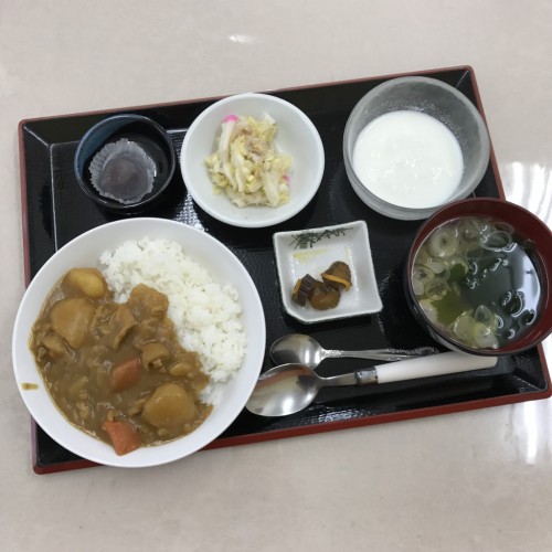 メニューは、カレーライス、白菜のコールスロー、スープ、漬物、牛乳寒天、くず餅です!