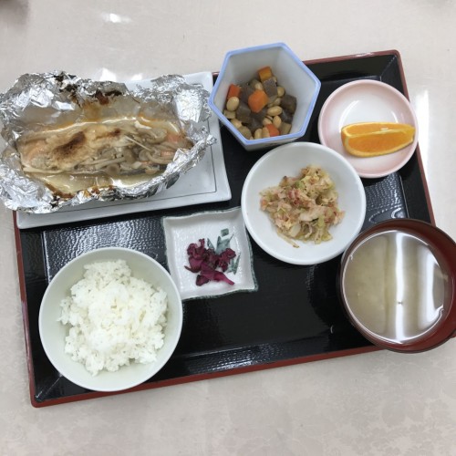 メニューは、鮭のホイル焼き、五目豆、キャベツの梅肉和え、ごはん、味噌汁、漬物、オレンジです!