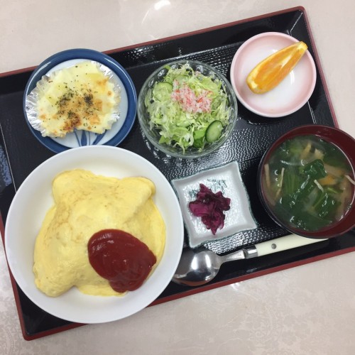 メニューは、オムライス、グラタン、野菜サラダ、スープ、漬物、オレンジです!