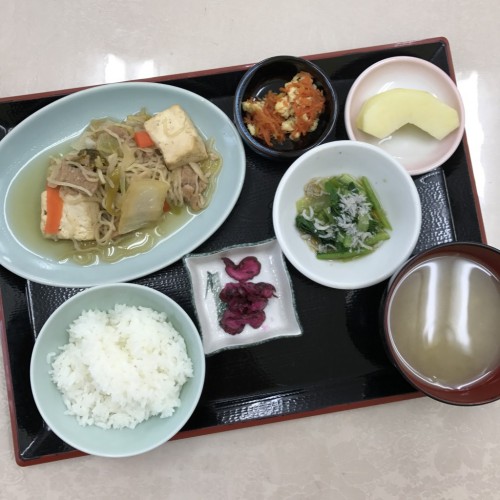 すき焼き風煮物、小松菜のしらす和え、人参の和え物、ごはん、味噌汁、漬物、りんごです!