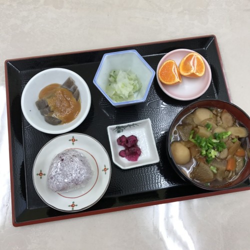 メニューは、けんちん汁そば、こんにゃくのみそ田楽、かぶの柚子胡椒和え、ミニおにぎり、漬物、みかんです!