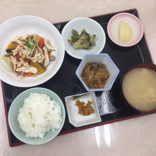 メニューは、蒸し鶏、切干大根の煮物、ブロッコリーの胡麻和え、ごはん、味噌汁、漬物、桃です!