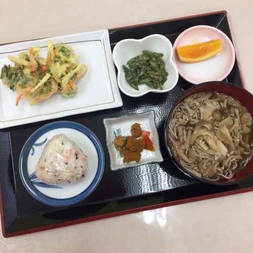 メニューは、きのこ餡かけそば、かき揚げ天、いんげんの胡麻和え、ミニおにぎり、漬物、オレンジです!
