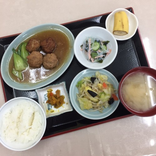 メニューは、肉団子の甘酢餡かけ、野菜炒め、春雨の酢の物、ごはん、味噌汁、漬物、バナナです!