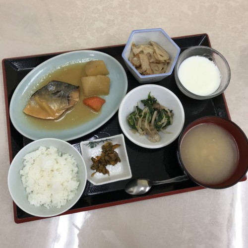 メニューは、さばのみそ煮、れんこんとさつま揚げの胡麻和え、ほうれん草としめじの和え物、ごはん、味噌汁、漬物、牛乳寒天です!