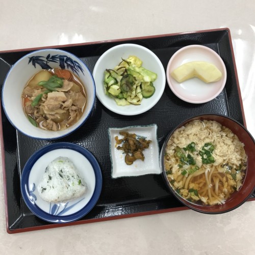 メニューは、かき玉うどん、肉じゃが、きゅうりの塩昆布和え、ミニおにぎり、漬物、りんごです!