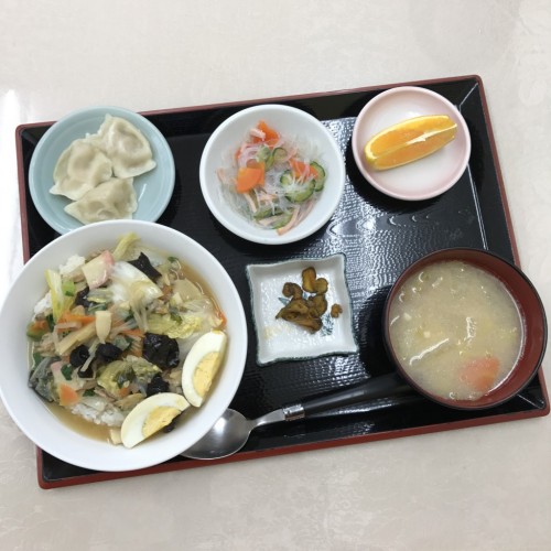 メニューは、中華丼、蒸しエビ餃子、春雨の和え物、味噌汁、漬物、オレンジです!