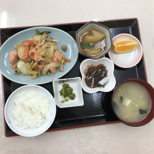 メニューは、鮭のちゃんちゃん焼き、大根のべっこう煮、もずく酢、ごはん、味噌汁、漬物、オレンジです!