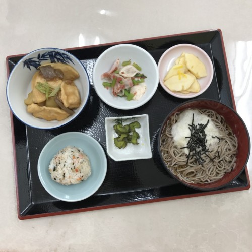 メニューは、とろろそば、じゃが芋と鶏肉の甘辛煮、かぶの梅酢和え、ミニおにぎり、漬物、ゆずりんごです!