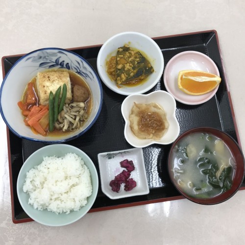 メニューは、揚げ出し豆腐、かぼちゃのそぼろ煮、大根のなめたけ和え、ごはん、味噌汁、漬物、オレンジです!