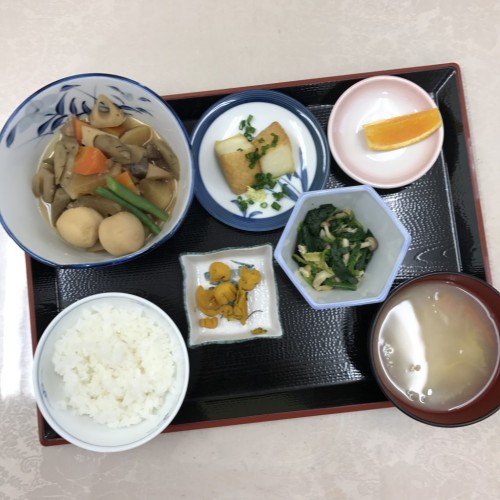 メニューは、筑前煮、絹厚揚げのしょうが醤油かけ、ほうれん草の和え物、ごはん、味噌汁、漬物、オレンジです!