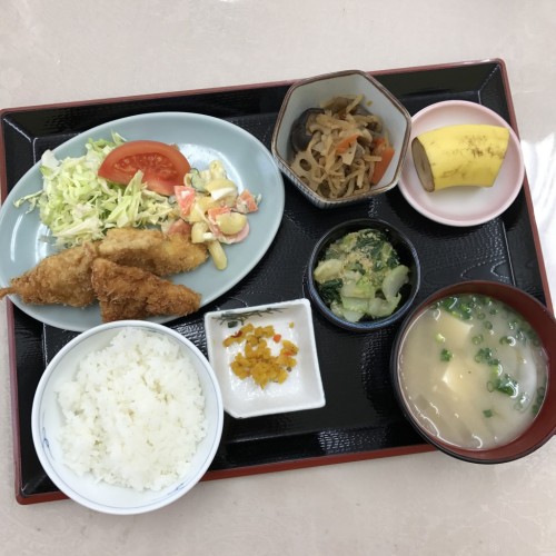 メニューは、はんぺんのはさみ揚げ、切干大根の煮物、チンゲン菜のピーナッツ和え、ごはん、味噌汁、漬物、バナナです!