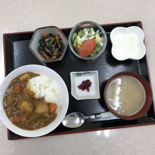 メニューは、カレーライス、ひじきの煮物、野菜サラダ、味噌汁、漬物、ヨーグルトです!