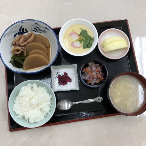 メニューは、イカと大根の煮物、野菜玉子蒸し、白菜のゆかり和え、ごはん、味噌汁、漬物、りんごです!