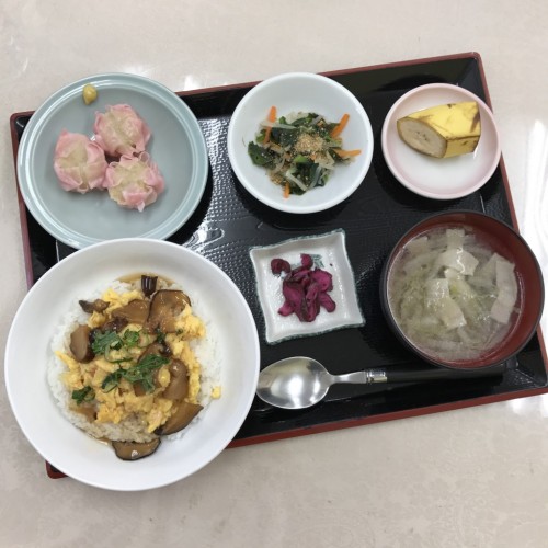メニューは、天津飯、蒸しシューマイ、野菜のナムル、スープ、漬物、バナナです!