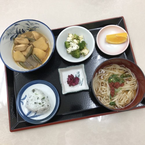 メニューは、梅うどん、じゃが芋と鶏肉の甘辛煮、ブロッコリーのおかか和え、ミニおにぎり、漬物、オレンジです!