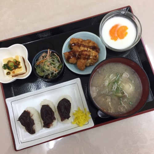 メニューは、ぼた餅、酢の物、冷奴、チキンカツ、豚汁、漬物、牛乳寒天です!