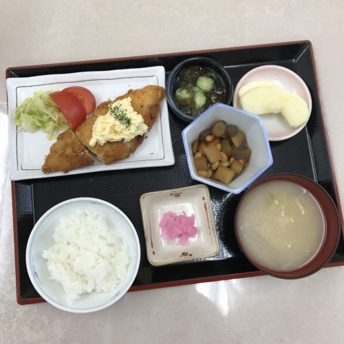 メニューは、白身魚のフライ、五目豆、もずく酢、ごはん、味噌汁、漬物、りんごです!