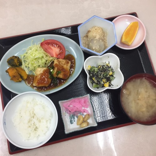 メニューは、豆腐ステーキ、里芋のそぼろ煮、ブロッコリーサラダ、ごはん、味噌汁、漬物、オレンジです!